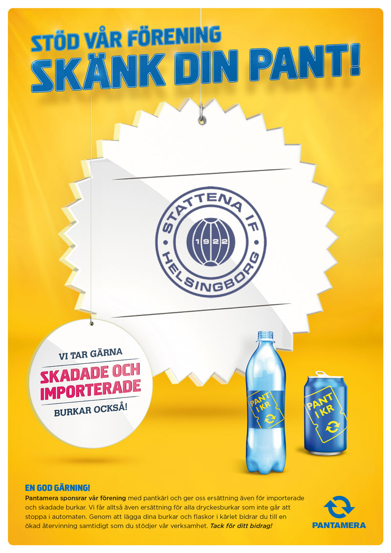 Stöd Stattena - ta med dina pet-flaskor och burkar och lämna dem i klubbens pantkärl. Som klubb kan Stattena få ersättning även för skadade och importerade burkar.